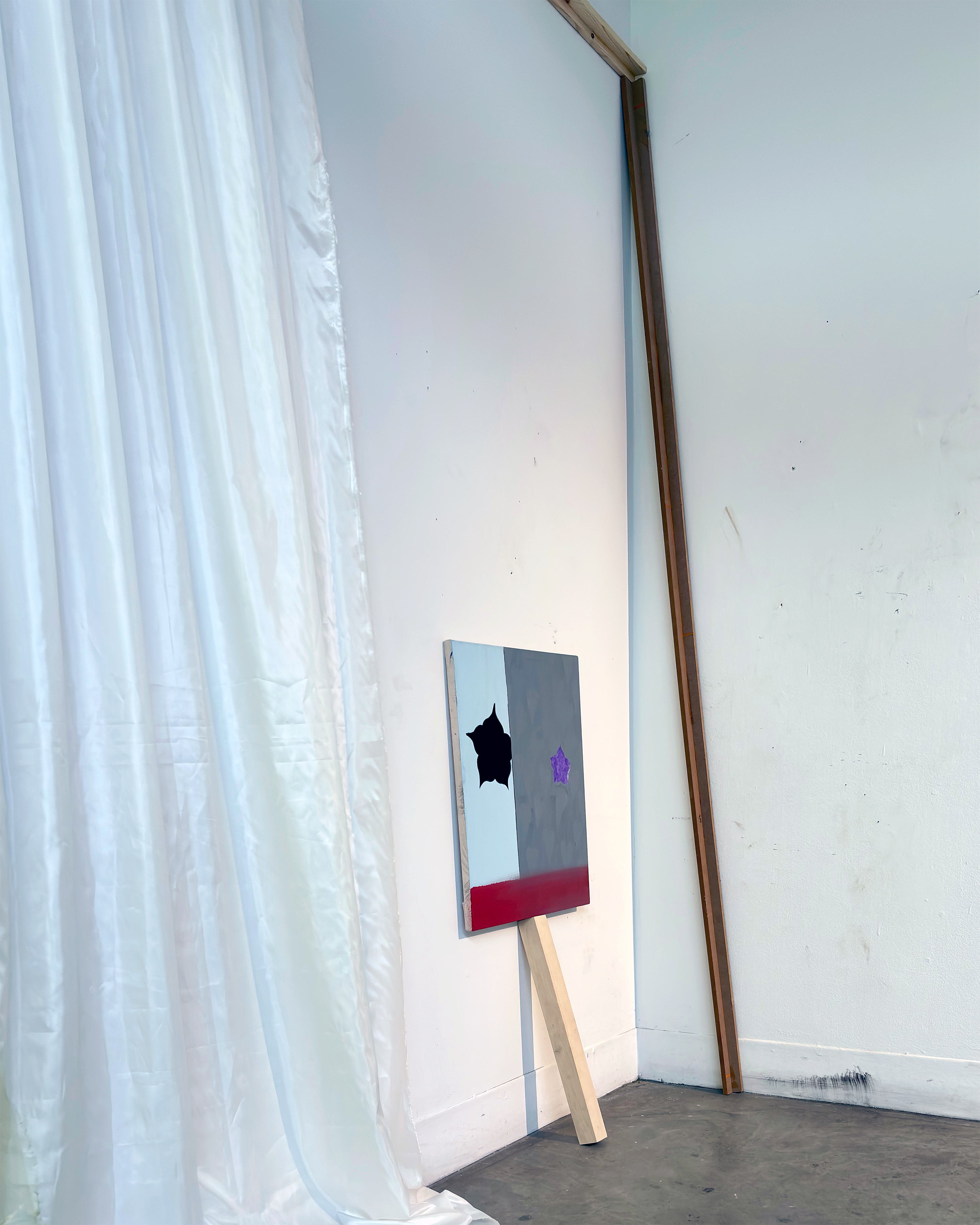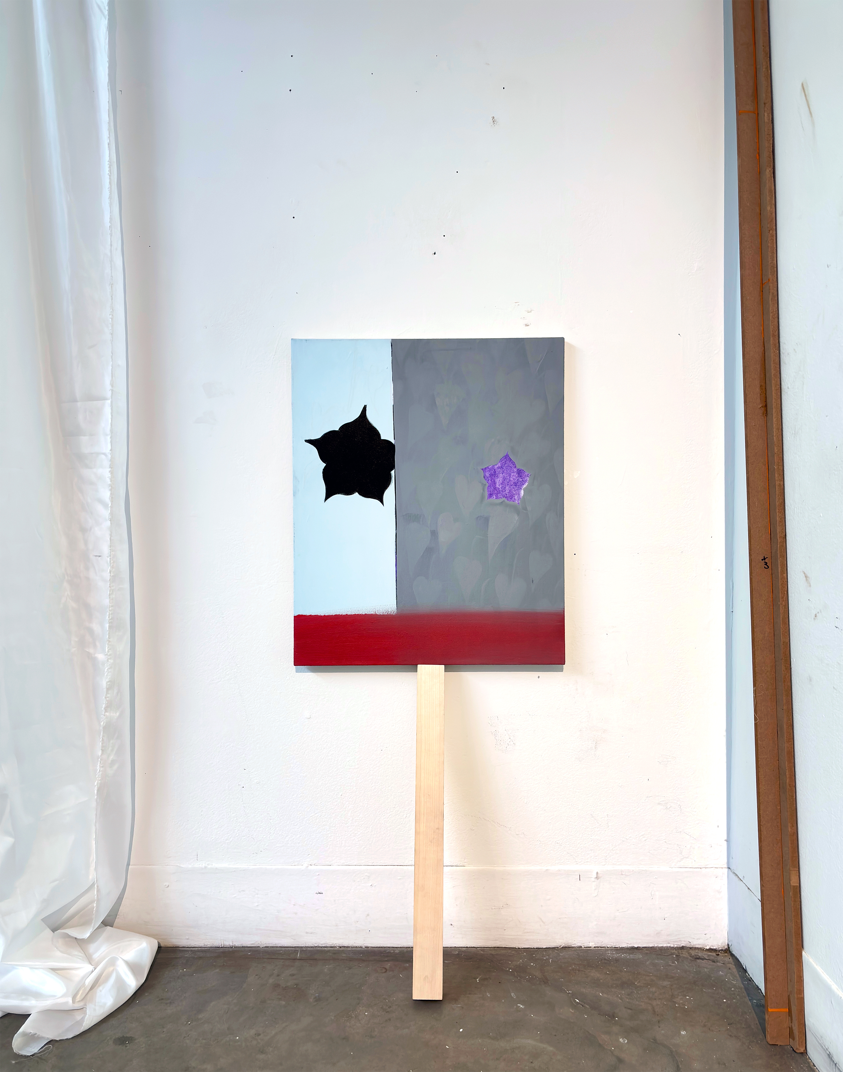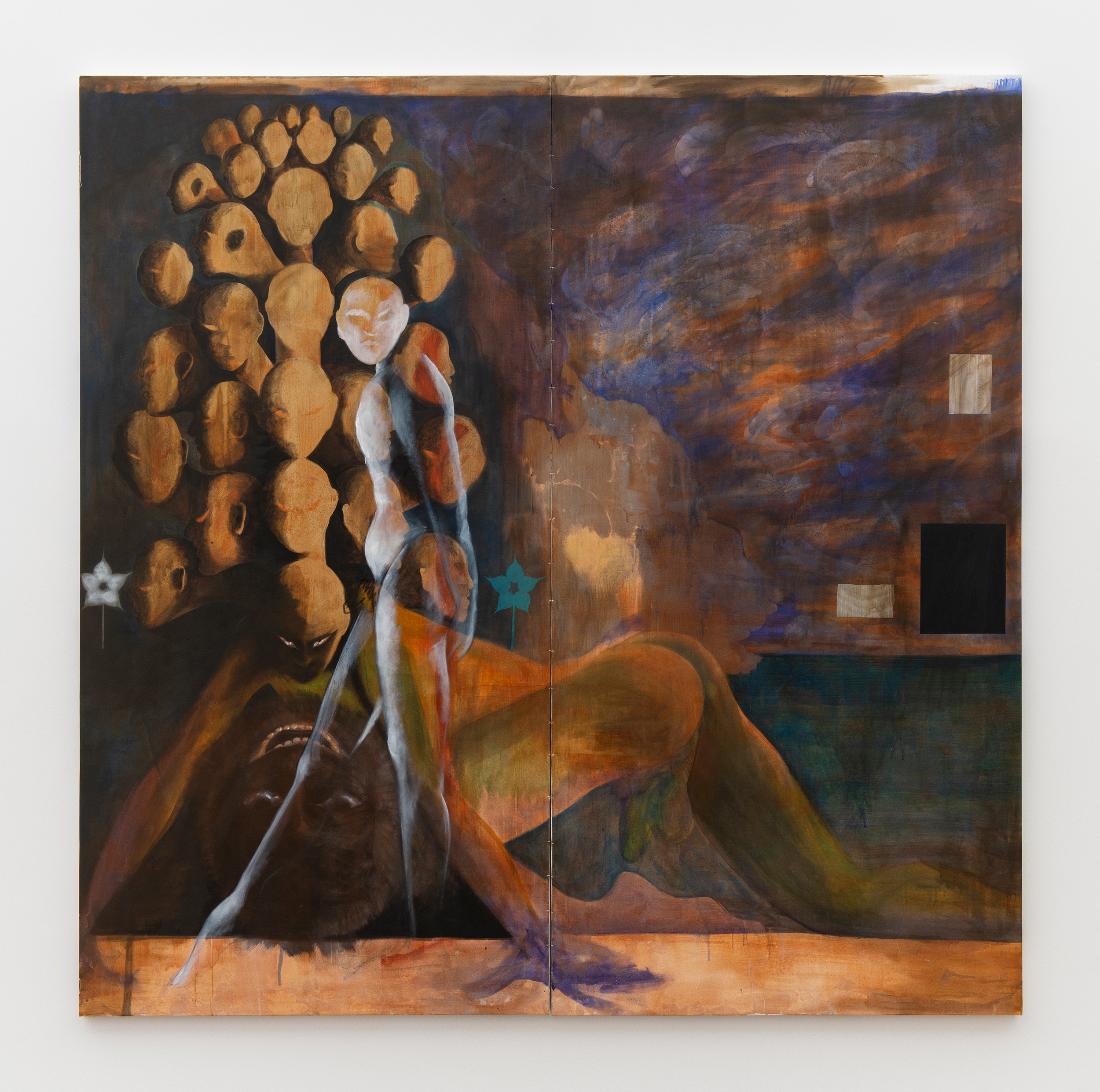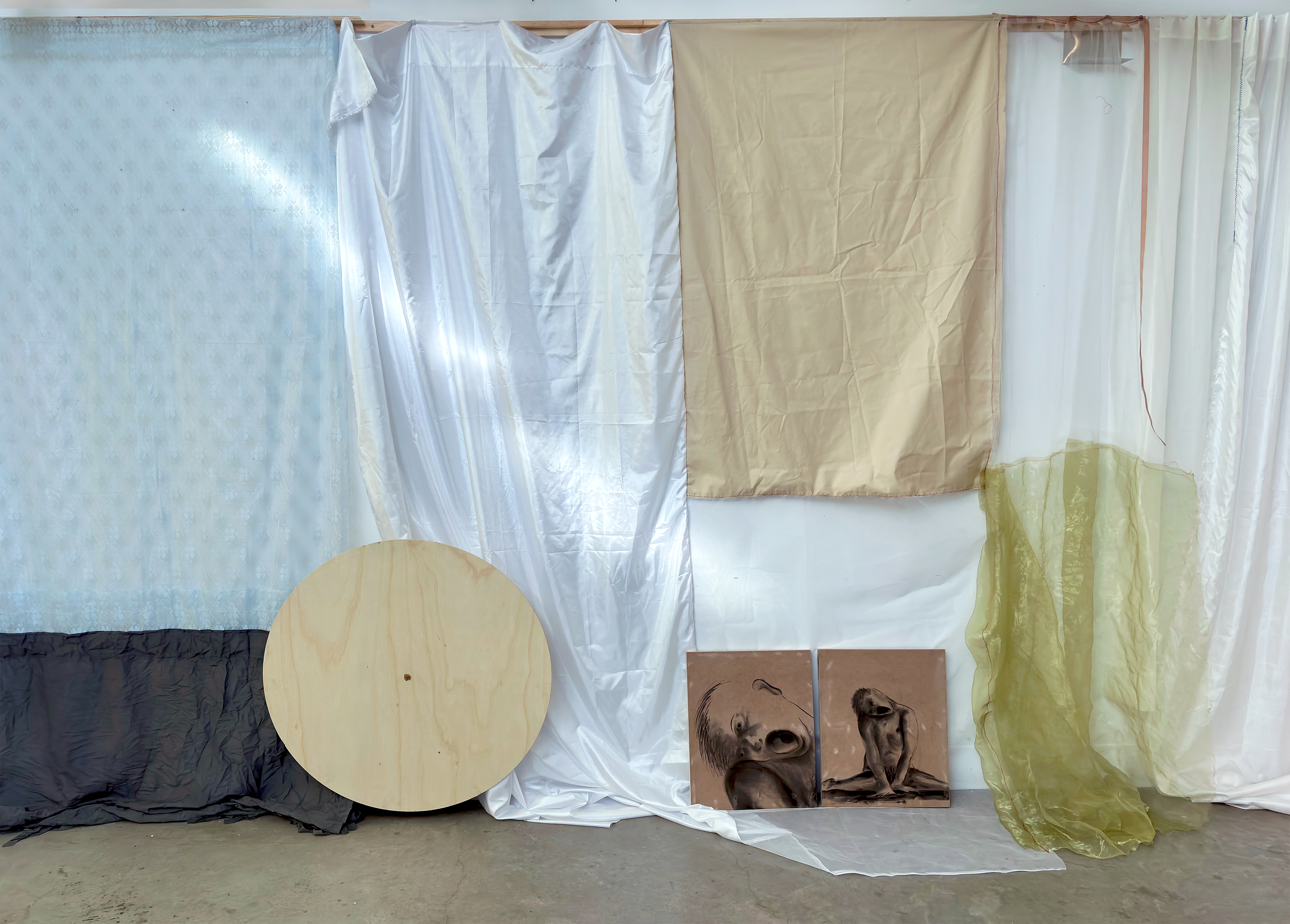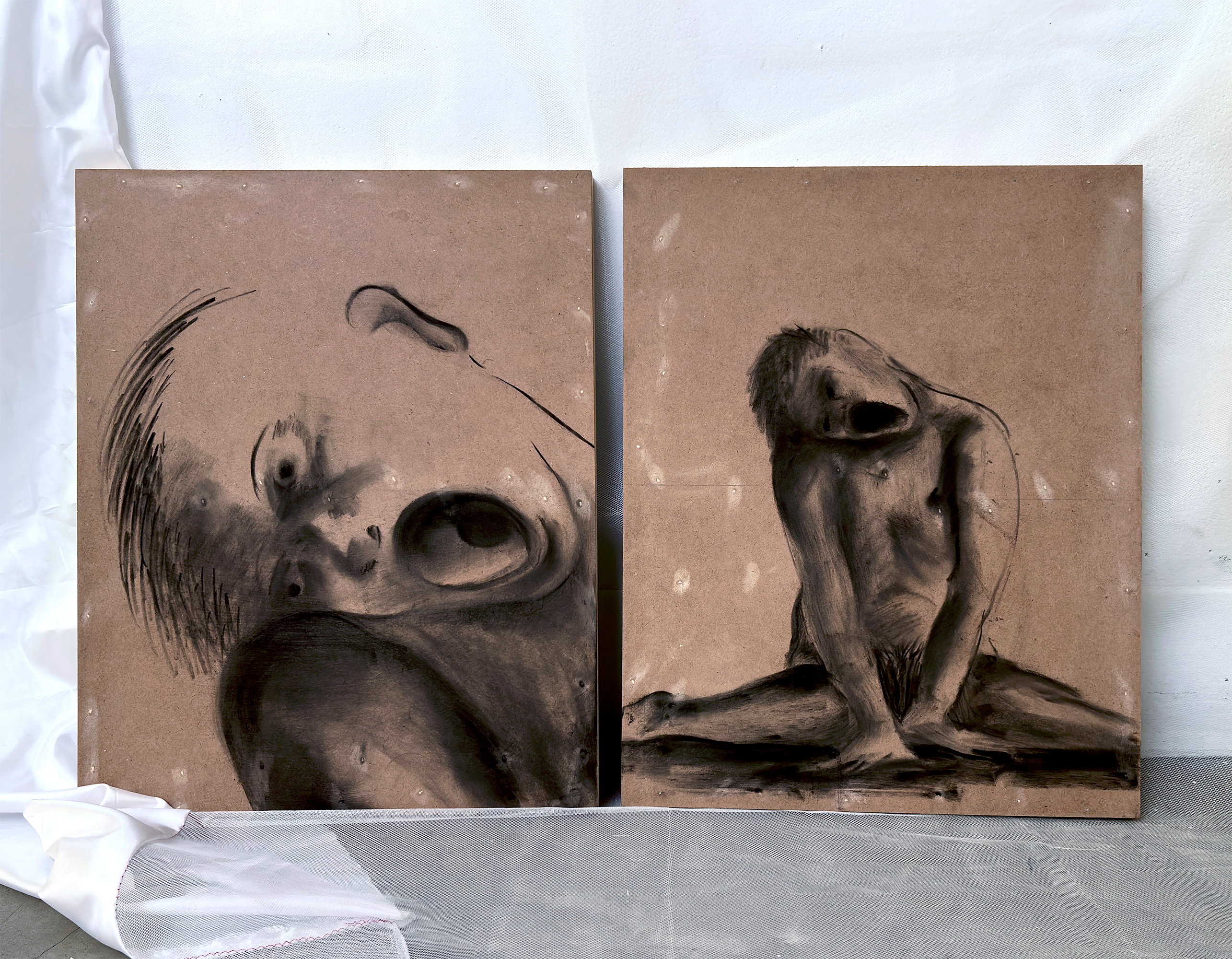 Acrylic, micaceous iron oxide, glitter, vinyl paint, watercolor, gouache, ink, graphite, charcoal, conte crayon, watercolor pencil, colored pencil on dropcloth stretched on panels.