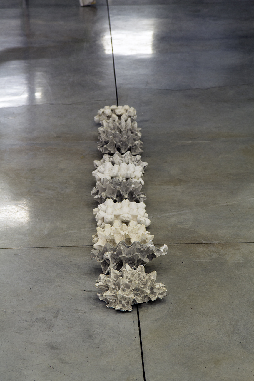 Plaster, paper tube, pressure-treated lumber, digital print, spray paint.